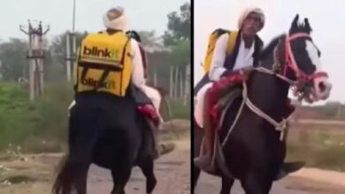‘रॉयल डिलीवरी’ का वीडियो वायरल, घोड़े पर सवार होकर ऑर्डर लेते दिखे Blinkit वाले अंकल